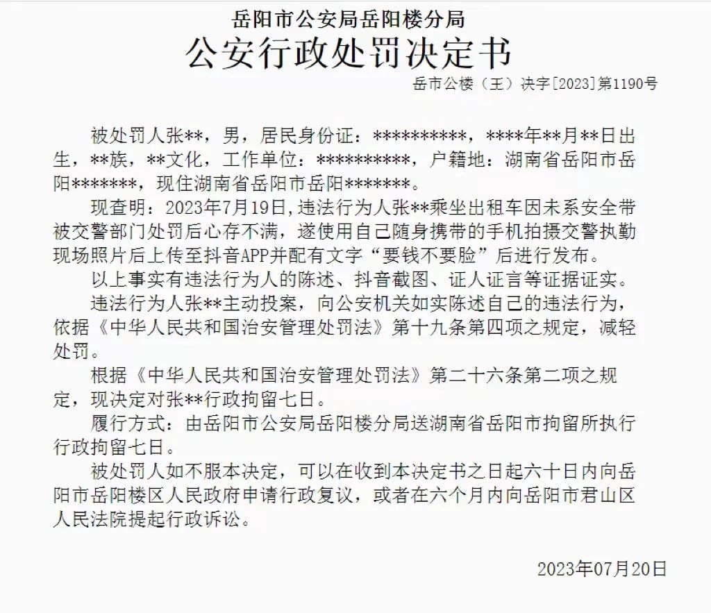 (本网讯:张新武 文和生)上车第一件事是做什么? 前排后排都要系哦 ······ 2023年07月19日,交警岳阳楼大队在国大路口开展“一盔一带”交通违法整治行动。上午9点59分许,执勤蜀黍发现一辆车牌为湘FT***9的出租车的前排副驾驶乘客未系安全带,随即指挥车辆靠边处理。该出租车副驾驶男子张某卫承认自身未系安全带,但拒不接受民警对其交通违法行为作出的处罚。且在民警核实其身份的过程中,与民警发生冲突,在现场大吵大闹,并辱骂民警,引起群众围观。执勤民警一直保持情绪克制,为不影响接下来的执法工作,在依法对张某卫开具处罚单后,未与其进行过多纠缠。 当日下午,张某卫在抖音网络平台发布现场民辅警执法图片,并配有文字公然辱骂,蜀黍移交辖区五里牌派出所处理。 违法行为人张某卫主动投案,向公安机关如实陈述自己的违法行为,依据《中华人民共和国治安管理处罚法》第十九条第四项之规定,减轻处罚。根据《中华人民共和国治安管理处罚法》第二十六条第二项之规定,现决定对张某卫行政拘留七日。 执法,是为社会保驾护航。 存疑,请以正当方式提出。 警示,网络不是法外之地。 公安机关必将依法打击! 一审:刘莎 二审:杨木易 三审:智铭